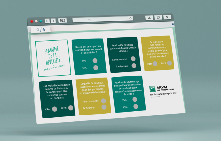 Un quiz ludique de 6 questions facile à déployer pour créer la surprise et interroger vos collaborateurs sur le thème que vous souhaitez : biais et stéréotypes, handicap, mixité, LGBT+, intergénérationnel… Pour chaque question, les participants « grattent » la réponse de leur choix, découvrent immédiatement s’ils ont la bonne réponse et une pop-up offrant un complément d’information apparait ! Le tout sur une interface 100% personnalisable.