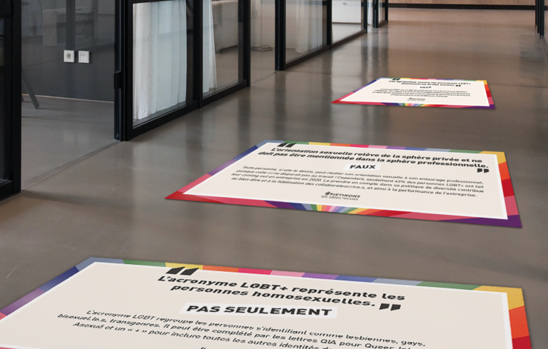Une campagne de communication visible, surprenante et simple à déployer, composée de stickers à coller au sol qui déconstruisent les idées reçues autour de la diversité ! À apposer dans des lieux de passage de votre entreprise, ils attireront à coup sûr l’œil de vos collaborateur.rice.s.