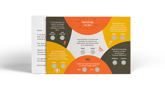 un format original et ludique pour tester les connaissances de vos collaborateur.rice.s et lever certains préjugés ! Ce quiz de 6 questions/réponses aig uisera la curiosité de vos salarié.es en abordant la thématique des maladies invalidantes à travers des personnalités, des chiffres clés, des mesures d’adaptations, etc.
